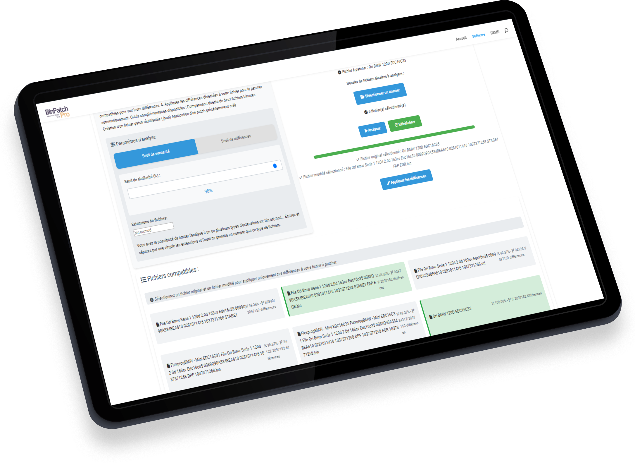 Grâce à la technologie Json vous pouvez créer en un instant les patchs de toutes les solutions (AdBlue, Stage1…) dont vous avez besoin, et les appliquer sur n’importe quel fichier compatible.